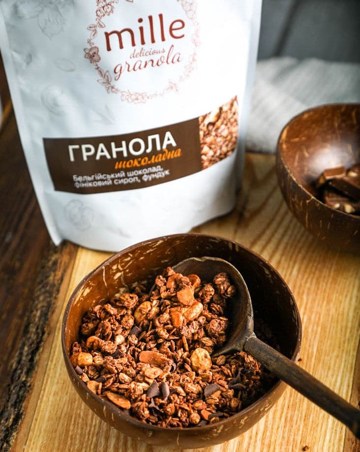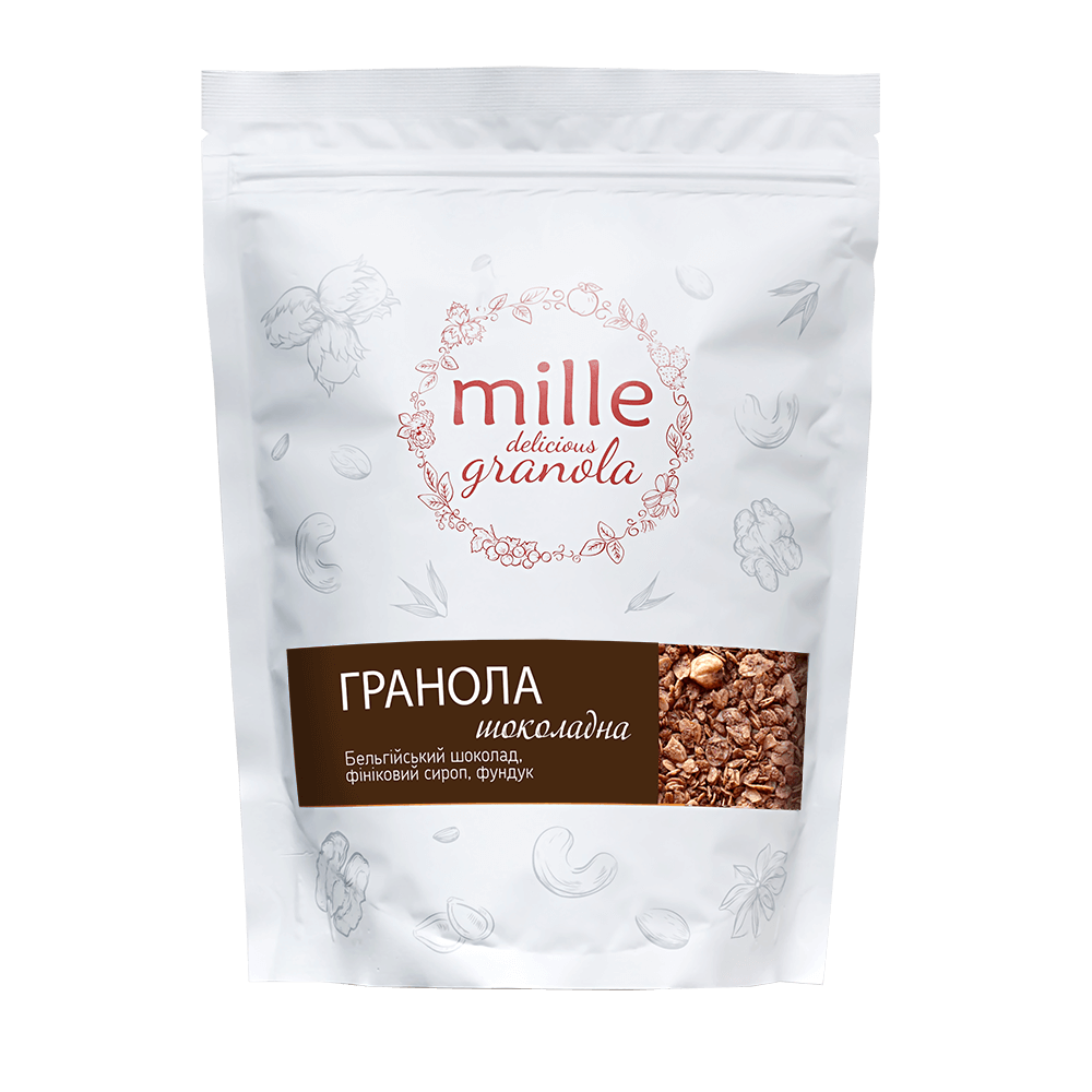 Ніжний аромат натурального какао у поєднанні з неповторним смаком чорного бельгійського шоколаду не залишать байдужим навіть самого вимогливого гурмана. Фундук, мигдальні пелюстки та волоські горіхи, злегка підсолоджені органічним фініковим сиропом, створили незабутній смак Шоколадної граноли. Даруйте собі неперевершені сніданки з вітамінів, мінералів, смаку та насолоди, кожного ранку!